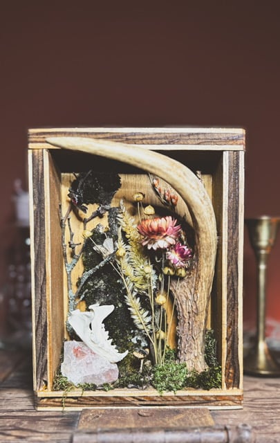 I love that my house just keeps giving me gifts. This 5"x8" shadowbox was crafted all out of wood found in the basement of my 125 year old home. The little hedgehog jaw is balanced on a beautiful piece of raw fire quartz, surrounded by a spray of dried flowers, & the tiniest mushroom. This piece is available to be placed on your favorite shelf, or hung in that perfect spot on your gallery wall.