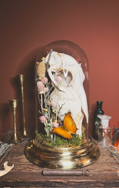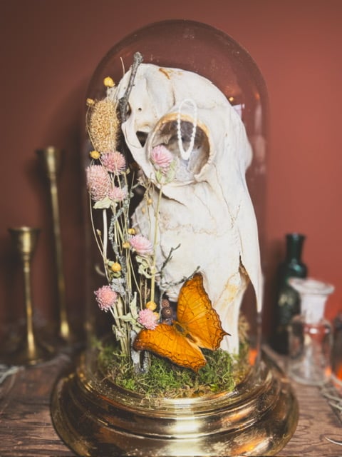 Talk about a balancing act all around. This sheep almost fills the space, so making sure it still was the star while adding adornments around it was a fun challenge. I kept this one delicate with some of my favorite lichen branched from my Azalea bush & a handful of my most muted flowers. The gorgeous orange butterfly is the perfect statement to balance the Sheep. This piece is a bit bigger at 15" tall 8" wide.